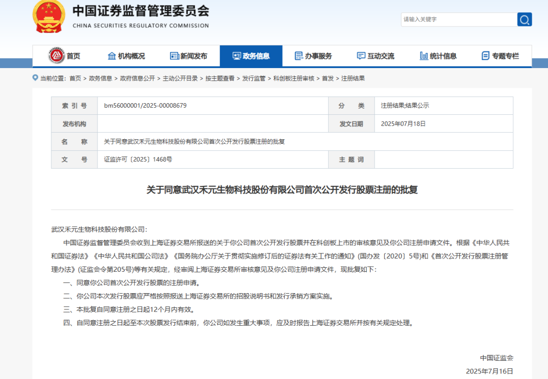 國家證監(jiān)會關于同意武漢禾元生物科技股份有限公司首次公開發(fā)行股票注冊的批復