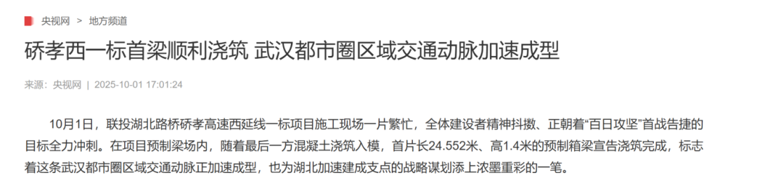 挺膺擔(dān)當(dāng) 建功支點? | 聯(lián)投湖北路橋硚孝西一標(biāo)首梁順利澆筑 武漢都市圈區(qū)域交通動脈加速成型